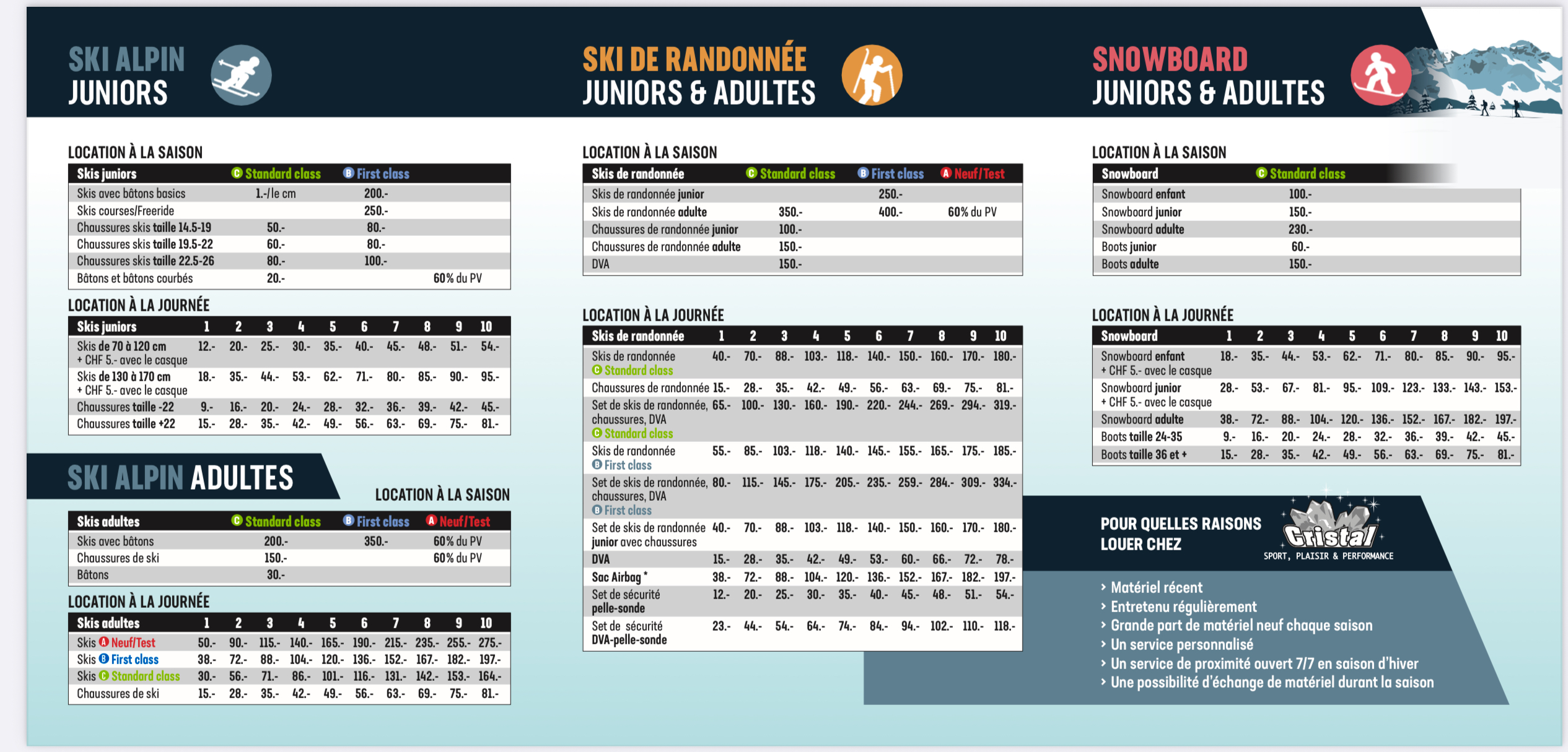 Vivez vos expériences sportives à prix raisonnables grâce à nos tarifs stables depuis 2009, nous vous proposons également du matériels de qualité renouvelés d’année en année pour vos locations à la journée ou à la saison